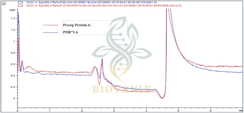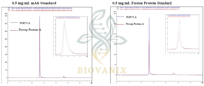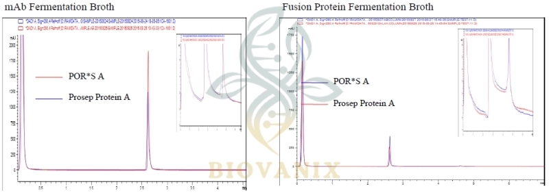 Las columnas Prosep Protein A y POR*S A son consistentes en cuanto a la forma del pico en blanco, la forma del pico estándar, la forma del pico de muestra, la linealidad de la curva estándar y la cuantificación de concentraciones conocidas de estándares y concentraciones desconocidas de caldo de fermentación cuando se prueban con métodos de uso común.